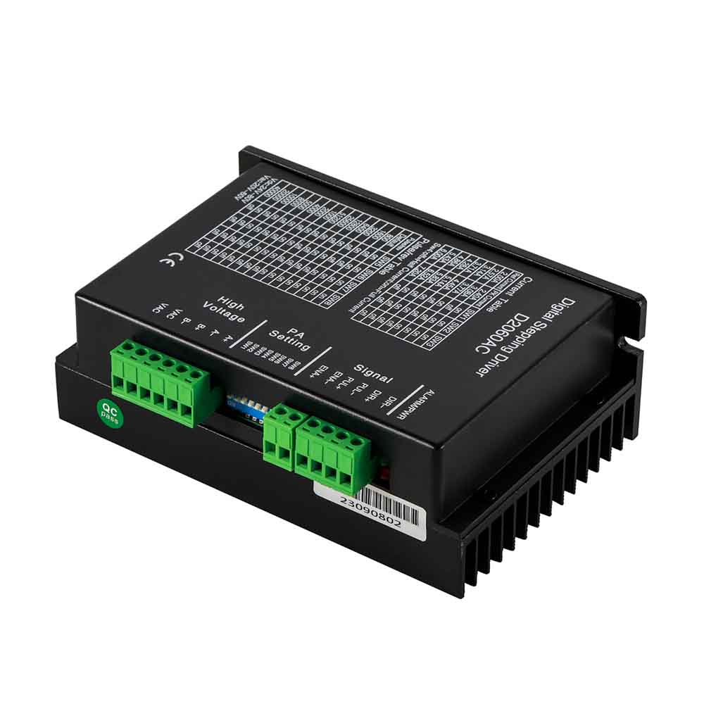 BFD2060AC is a new generation digital 2- phase stepper motor driver, based on a 32-bit DSP processor, combination of the anti-resonance, low noise, micro-step and low temperature rise technology significantly improve the performance of the stepper motor, has low noise, small vibration, low temperature rise and high-speed torque. The driver use online adaptive PID technology, without manual adjustment can be automatically generated optimal parameters for different motors, and achieve the best performance. Supply voltage range from 20VAC to 60VAC or from 24VDC to 90VDC, suitable for driving various 2-phase hybrid stepping motors which phase current below 7.2A. The microstep can be set from full step to 51200steps/rev and the output current can be set form 2.4A to 7.2A; with automatic idle-current reduction, self-test, overvoltage, under-voltage and over-current protection.
